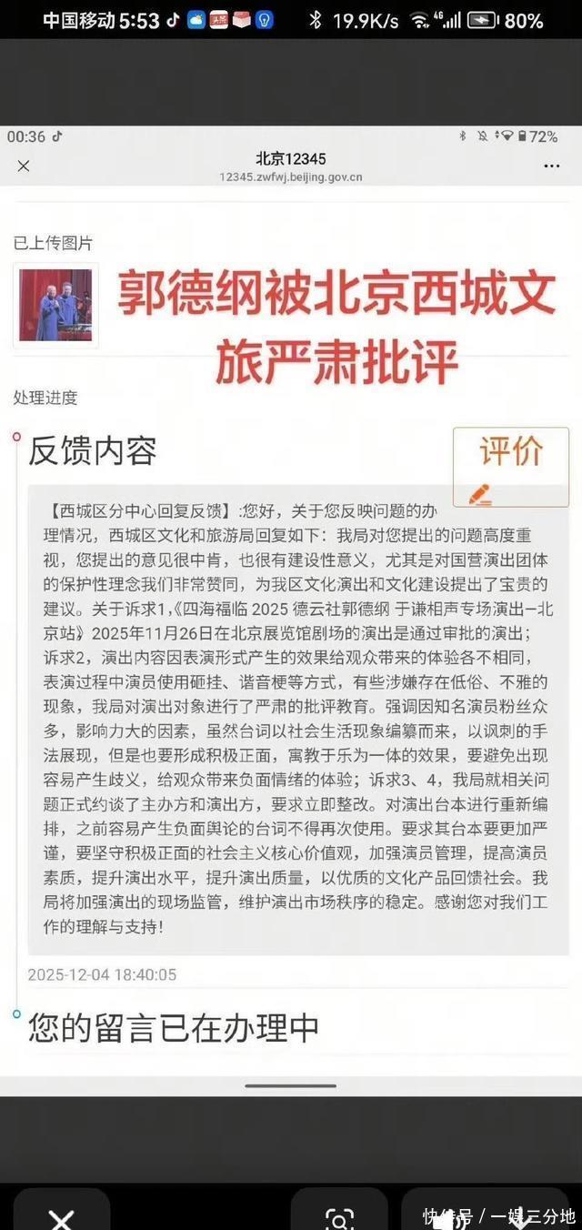 事件的起点要追溯日,北京北展剧场内,德云社《四海福临》专场演出如期举行,郭德纲与于谦联袂献上了时秒的相声《艺高人胆小》。这场看似常规的剧场表演,并未在当时引发波澜,却在数日后成为舆论焦点。据流传的完整演出视频显示,作品中包含了诸多相声常见的创作手法:谐音梗的巧妙运用,将理发师“小杰”戏称“小姐”;对搭档于谦的日常调侃,涉及刮脸、醉酒等生活场景的伦理哏设计;而最受争议的,是一段长分钟、针对“三十年前曲艺团体”怪现状的讽刺段落。 在这段引发热议的内容中,郭德纲用幽默的笔触勾勒出昔日行业里的一些乱象:用“万里无云、星光灿烂”暗讽当时相声界的风气不正;通过“勾勾搭搭”(黄豆芽炒绿豆芽)、“悄悄话”(猪耳朵拌猪舌头)等趣味菜名,调侃部分团队的官僚作风;以“团长副团长坐满一排,演员仅四人”的夸张对比,映射外行指导内行的尴尬境况,“强行慰问演出”“匿名诬告大奖赛”等表述更是引得现场观众阵阵发笑。彼时无人预料,这些在剧场内收获掌声的内容,会在不久后引发投诉风波。 12日,一份提交给北的投诉截图在网络出现,投诉者直指《艺高人胆小》存在“大量伦理哏、屎尿屁、荤段子”,并认为作品中对昔日曲艺团体的描述属于“造谣抹黑国营院团”。四天后,标注“西城区分中心回复反馈”的截图流出,明确提到演出中“部分砸挂、谐音梗涉嫌低俗不雅”,相关部门已对演出方进行批评教育,并正式约谈主办方,要求重新编排台本,禁用易产生负面舆论的台词。12日晚,个人微信公众号“起社”发布的《郭德纲被约谈》一文,将事件推向高潮,“北京市西城区文旅局认定作品低俗并要求整改”的说法迅速扩散。 面对汹涌的舆论,郭德纲日上午通过微博间接回应,一句“昨晚无锡演出,人心雅静,素质极高”被网友解读为对传言的回应,而德云社官方及经纪人并未给出明确表态,多次拨打的联系电话也未获接听。另一边,媒体记者日上午联系北京市西城区文旅局求证,工作人员表示采访需经区委宣传部授权,对于网传截图的真实性暂无法回应;区委宣传部则透露文旅局将有专门新闻发布,但直至截稿前,相关部门仍以“等待领导调度”为由,未给出明确答复,让事件真相仍笼罩在迷雾之中。