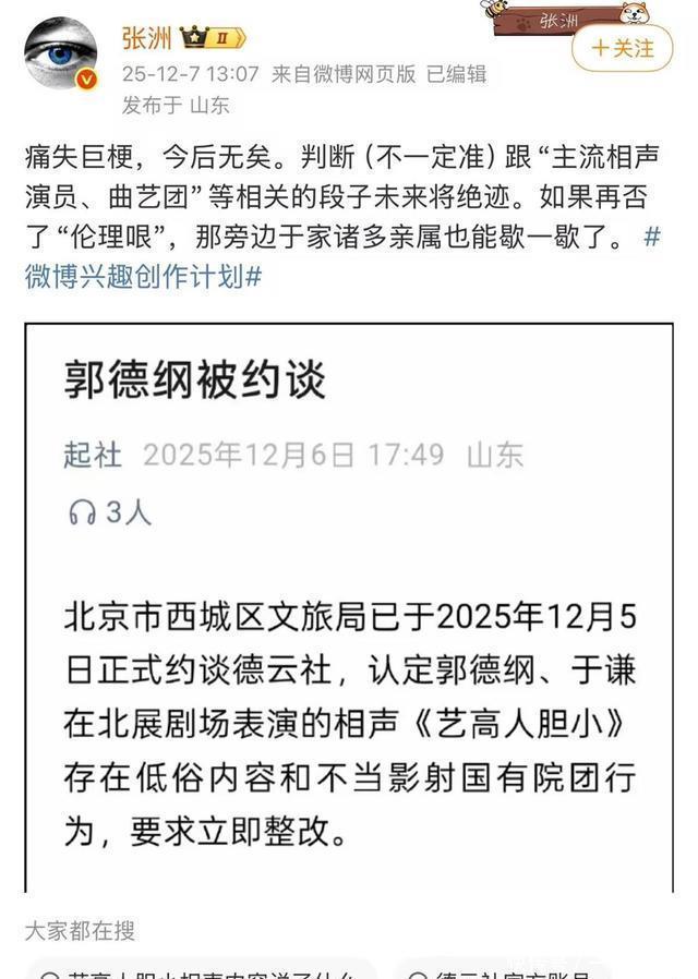 传言发酵的同时,网友的讨论已呈两极分化之势,理性声音与多元观点在网络空间碰撞。支持整改的网友认为,“娱乐须有尺度,表演要有边界,相声不能以艺术为名突破公序良俗底线”,部分观众表示,伦理哏与低俗段子的界限模糊,尤其在公共演出场合,应考虑不同受众的接受度,避免造成不良影响。 而更多网友则表达了不同看法,微博大V“张洲”一句“痛失巨梗,今后无矣”道出了不少粉丝的惋惜,大V“诗人老王”的“此处可发一叹”更是引发广泛共鸣。有网友理性分析:“讽刺本就是相声的核心功能之一,作品聚焦的是三十年前的行业现象,并非针对当下国营院团,为何要对号入座?”不少长期关注相声的观众指出,《艺高人胆小》是历经多场演出的老段子,此前从未引发争议,“剧场相声本就有其独特的表演语境,与电视转播内容应有所区别,不能用同一标准苛责”;还有网友担忧:“若过度限制讽刺表达,相声会失去其尖锐的艺术特质,最终沦为单纯的搞笑闹剧,这样下去相声真的要‘完了’”。